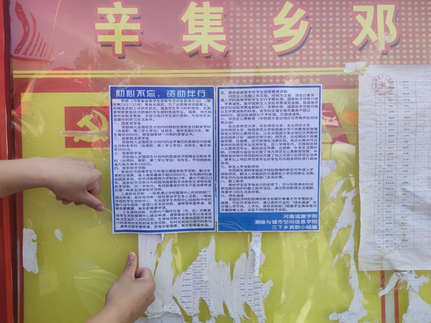 (通讯员 陈金辉)2021年7月1日,beats365唯一官方网站2021暑期“三下乡”“护航梦想,资助同行”服务小队正式开始进行暑期三下乡的社会实践活动,为响应国家党中央、国务院关于资助政策的号召,保证资助政策的深入实施,扩大宣传力度,让基层全面、准确地了解国家资助政策。团队成员围绕“护航梦想,资助同行”主题深入河南省平顶山市鲁山县辛集乡邓寨村开展宣传活动。
