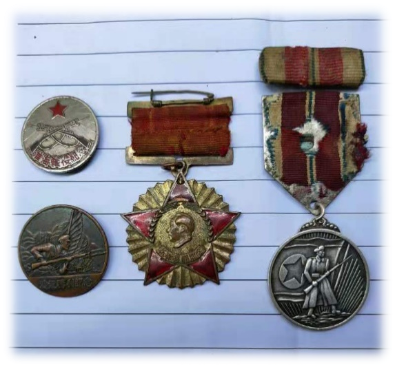 图为当地老革命在革命年代所获勋章,实践团成员参观并拍照留念