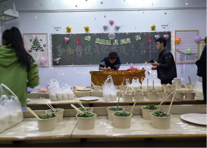 活动前一天晚上,各班组织委员与团支书带领其余班委和志愿同学布置会场,整洁的桌面和精美的装饰都突显出各班对此次活动认真的态度。活动当天,各班同学积极有序地来到班级,桌面上已经摆放好提前购买的饺子皮与馅料,还有厨具与一次性碗筷。活动开始后,同学们都跃跃欲试,拿起饺子皮大展身手。因为新鲜出炉的饺子包含着同学们的辛勤劳动以及对冬至的盼望喜爱,所以吃着也别有一番滋味。之后,各班又进行了文艺汇演,在欢声笑语之中,本次活动圆满结束。