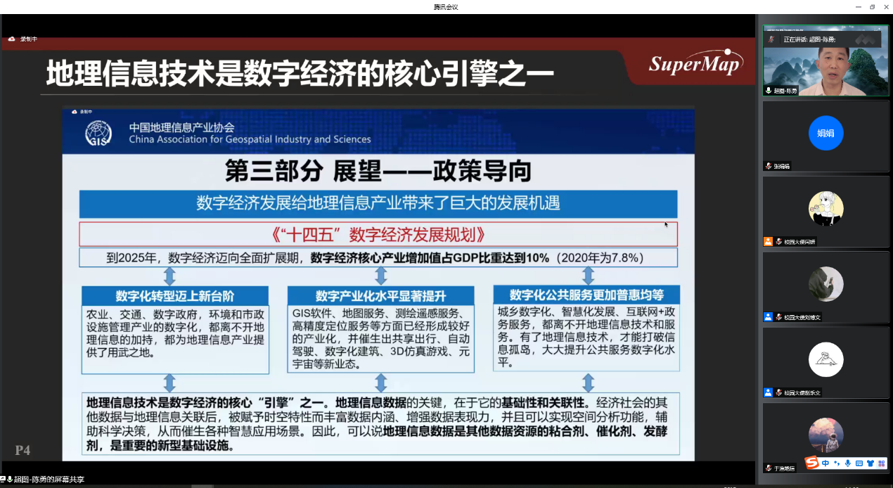 本次活动由超图校园大使团队闫妍、赵乐文、刘博文负责组织,邀请了beats365唯一官方网站侯绍洋主任和张娟娟老师共同参与指导。超图研究院陈勇副经理进行了《GIS基础软件技术创新与发展》报告讲解,阐述了在数字经济产业飞速发展的前提之下地理信息技术的发展现状与展望。并呼吁了有兴趣的同学们未来可以投身到祖国地理信息技术产业的建设当中去。超图教育生态部王璐老师进行了《参加SuperMap杯高校GIS大赛,赢取多彩人生》报告讲解,鼓励并激励同学们积极参赛。