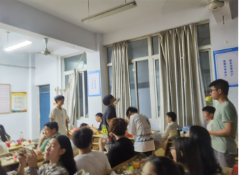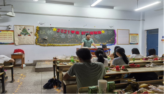 首先,主持人介绍了端午节的由来;接着,由辅导员许东辉老师发言,表达了对同学们的衷心祝福和殷切希望,并预祝大家过个健康幸福的端午佳节;随后由两个班的同学们轮流登台表演节目或参与游戏,大家边做游戏边吃粽子,品美食,其乐融融。