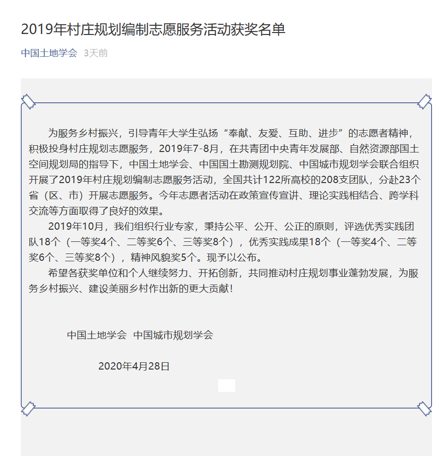 2020年5月9日微信公众号“中国土地学会”发布了2019年村庄规划编制志愿服务活动获奖名单,链接如下: