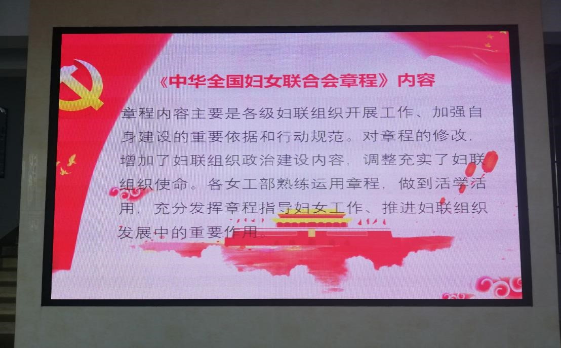 会上,副书记卫柳艳介绍了本次大会召开的盛况,传达学习了《高举习近平新时代中国特色社会主义思想伟大旗帜团结动员各族各界妇女为决胜全面建成小康社会实现中华民族伟大复兴的中国梦而不懈奋斗》的报告,并对《中华全国妇女联合会章程》各章节进行领学。会议要求,公司全体女教职工要进行深入的学习。将学习成果转化为推进妇女工作进一步发展的动力,以更加饱满的热情,促进公司工作再上新台阶。