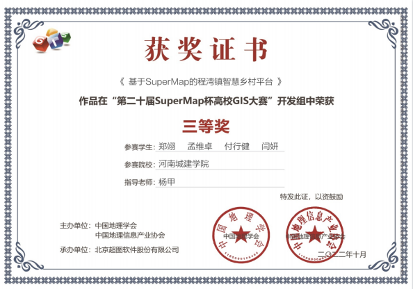 11月5日,第二十届SuperMap杯高校GIS大赛(中国赛区)开发组获奖名单公布。公司beats365唯一官方网站地理信息科学专业学子郑翊、孟维卓、付行健、闫妍组成的参赛团队在杨甲老师指导下,在本次大赛中获得开发组比赛三等奖。