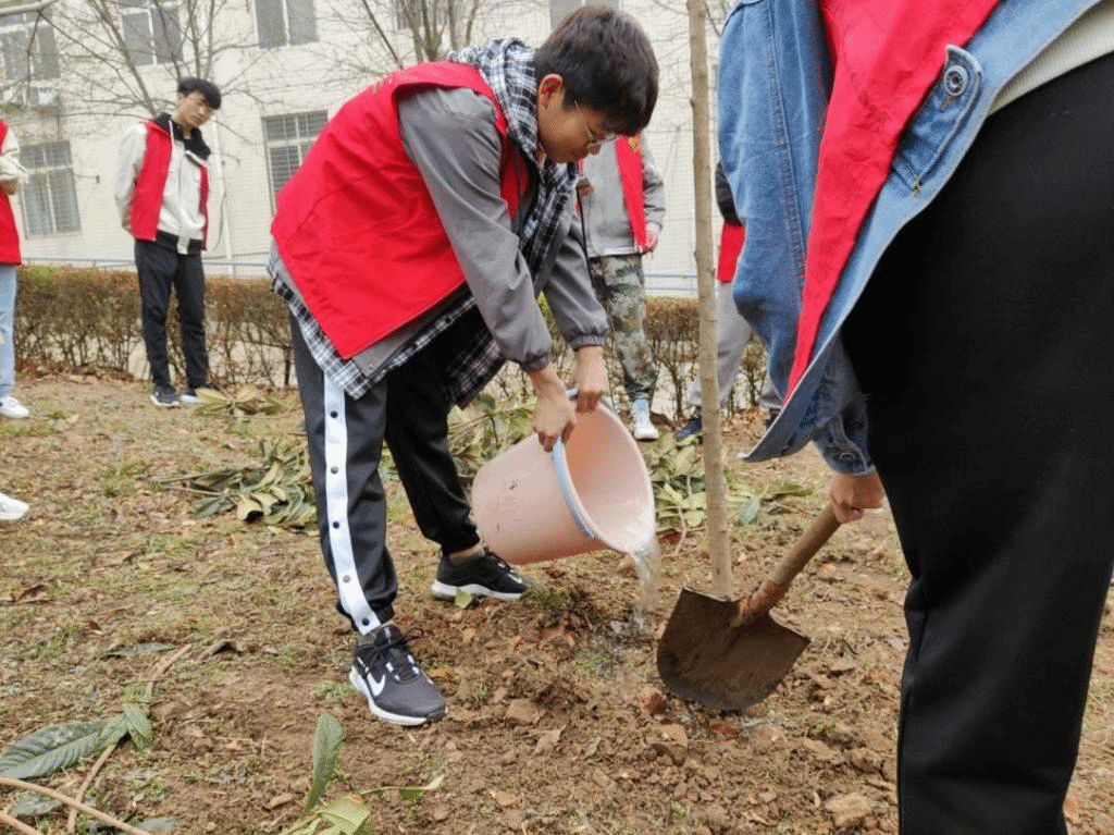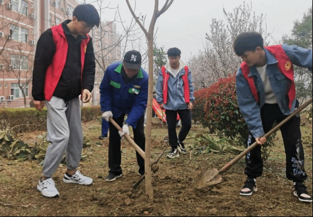 活动伊始,志愿者们带着铁锹、锄头、水桶等工具和分发的小树苗,在空地上找好合适的位置开始挖坑埋石。植树过程中,大家分工合作,刨土栽苗,松土浇水,不怕脏、不怕累,干劲十足,校园里的环卫师傅也积极帮助和指导志愿者们植树。经过两个多小时的辛勤劳动,一排排小树苗在春风中尽显盎然生机。