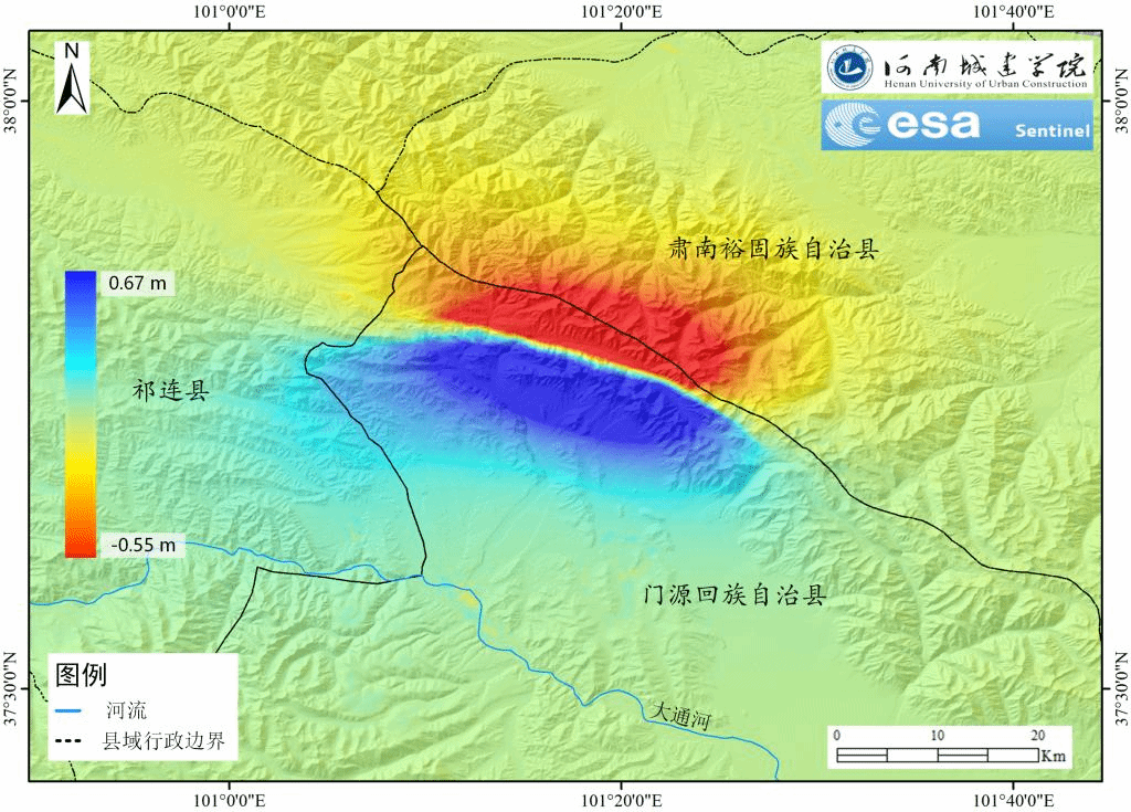 遥感科学与技术系孙亚飞博士率领董昊宸、马文浩等科研人员利用欧空局(ESA)高分辨率(距离向×方位向:5 m×20 m)哨兵Sentinel-1A卫星的TOPSAR雷达数据(C-band)进行快速处理,获得了该地震形变场。采用2021年12月29日(震前)和2022年1月10日9(震后)相隔12天的雷达数据(Interferometric Wide Swath(IW))进行干涉,去地形等处理后,获得了此次地震造成地表形变的干涉图(见图1),一个干涉条纹代表视线向28毫米的地表变化值,地震形变条纹围绕冻龙岭断裂带西段和托莱山断裂带东段分布。此外,进一步获取了门源地震的地表形变结果(见图2),红色代表下沉,最大值为-0.55米,蓝色代表抬升,最大值为0.67米。科研人员给出了清晰的形变中心和空间分布,可为灾情研判和灾后救援提供重要参考依据。