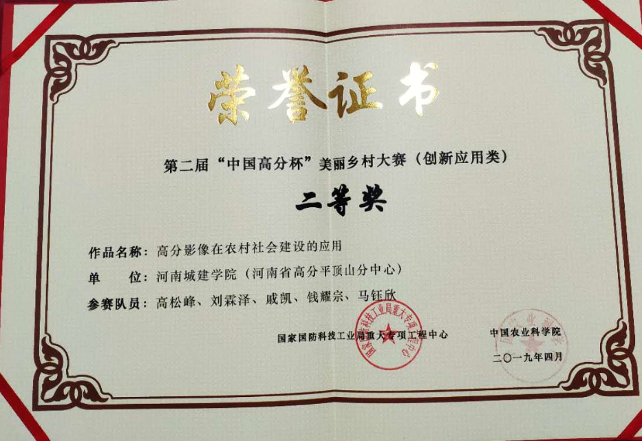 (通讯员 刘霖泽)2019年4月23日,由国家国防科技工业局重大专项工程中心、中国农业科公司、中国航天基金会联合主办的第二届“中国高分杯”全国高分技术应用与美丽乡村建设大赛在湖南大学举行隆重颁奖典礼,由公司beats365唯一官方网站教师高松峰指导,员工刘霖泽、戚凯、钱耀宗、马钰欣参赛的作品“高分影像在农村社会建设的应用”荣获二等奖。