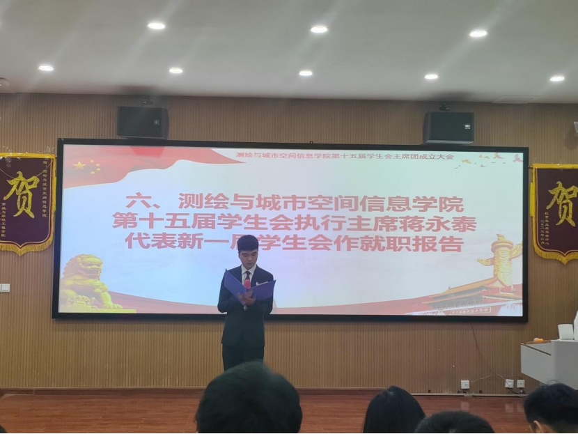 大会在庄严的《国歌》声中拉开序幕。首先由团学办副主任常莉致开幕词。回顾过去的一年,她由衷感激第十四届员工会主席团成员的突出表现,并殷切希望第十五届员工会成员能够肩负起重任,砥砺前行;随后,第十四届员工会执行主席仝豪强向全体成员作述职报告;随后辅导员郭军学宣读了第十五届员工会主席团成员名单;新一届执行主席蒋永泰代表第十五届员工会主席团作就职报告。