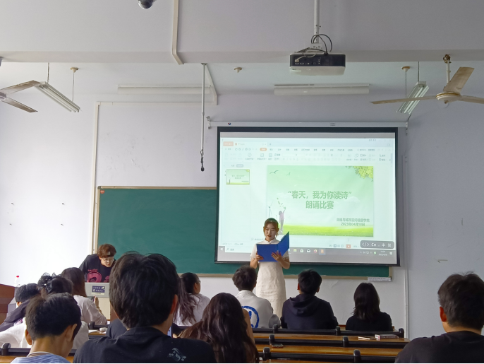 在本次比赛中,参赛选手们带着意气风发的磅礴气势,运用背景音乐搭配着自身的语言、动作以及表情激情澎湃的歌颂春天,有感情、有深度的表达了对生活的热爱。参赛选手们饱含深情的朗诵使得现场的观众身临其境。历经一个多小时的激烈比拼与评委们的斟酌评分,选出一等奖一名,二等奖两名,三等奖三名。本次比赛在同学们努力拼搏的面庞伴随着努力的汗水中圆满落幕。