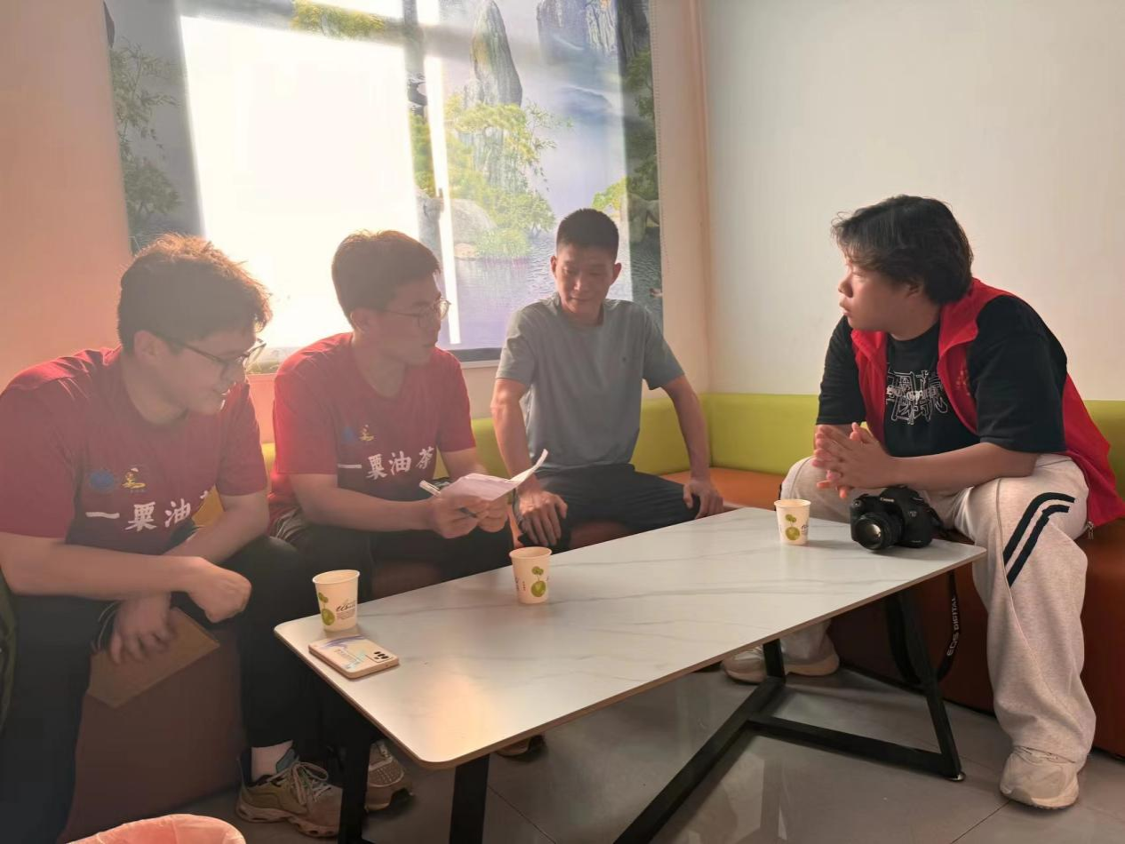 南王岗村村书记夏桂梅为实践团队讲解村庄特色油茶产业的发展。她说:油茶产业在南王岗村经济中占据着重要作用,油茶树成为南王岗村一道特色的风景线。她还向我们分享了发展特色产业的宝贵经验,通过结合近年来工作实例,向我们介绍了优秀返乡扶智青年陈辉同志,他在早年创业后,仍然心系光山县的发展,总结多年创业经验提出“想要跑的快,得有火车头带“的道理,主动请缨在村委会中担任南王岗村村主任职务,助力乡村产业振兴,给村民们打上一针共同富裕的强心剂,为南王岗村的产业发展提供新的动力。