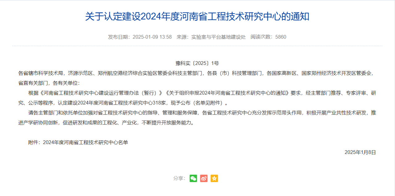(通讯员:赵苗兴)近日,河南省科技厅发布了《关于认定建设2024年度河南省工程技术研究中心的通知》,公司申报的“河南省自然资源智能监测与生态治理工程技术研究中心”成功获批。该中心的获批标志着公司实现省级科研平台零的突破,将为公司学科发展和服务地方生态文明建设注入新动能。