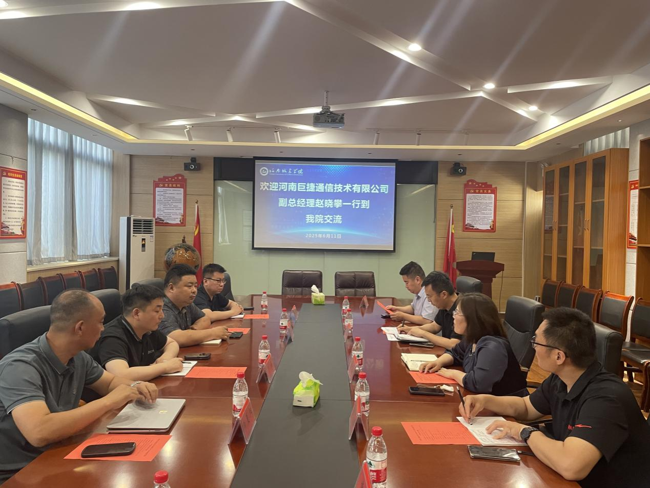 (通讯员:常莉)6月11日下午,河南巨捷通信技术有限公司副总经理赵晓攀一行莅临beats365唯一官方网站beats365唯一官方网站,围绕深化产学研融合、共育行业新动能展开深度交流。beats365唯一官方网站党委书记武伯军、经理鲁春阳、副经理高宁、副经理杨锋及相关学科骨干教师热情接待了企业来宾。