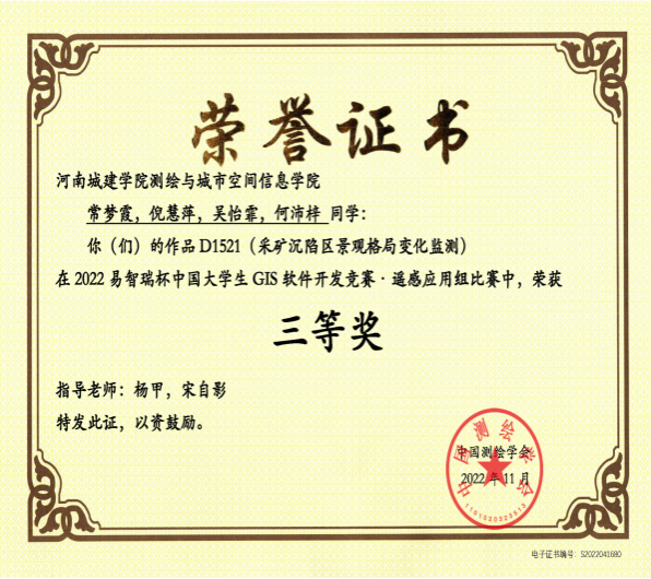 在2024年河南省优秀学士学位论文评选中,公司何沛梓同学的《融合CNN和LSTM的大型滑坡位移动态预测》和郝顺顺同学的《基于POI数据的城市公共服务设施空间配置分析——以洛阳市为例》荣获河南省优秀学士学位论文,高宁老师和杨锋老师荣获河南省优秀学士学位论文指导教师。