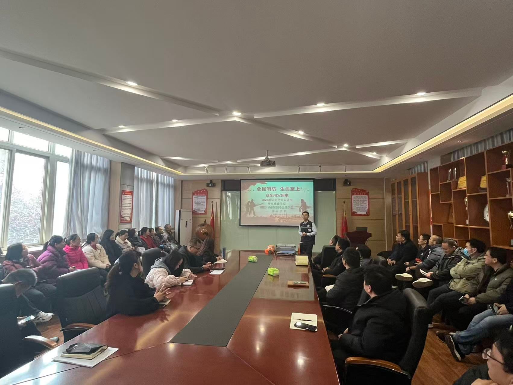 培训中,郑文剑以“全民消防,生命至上—安全用火用电”为题,围绕火灾危险性和防火措施进行了系统讲解。授课过程中结合了日常生活中真实火灾案例进行了详细讲解并重点介绍了消防设备、灭火器、灭火毯等消防器材的使用方法。同时重要讲解了日常防火要点、火场逃生自救技巧以及灭火技巧等关键知识帮助参训教师深刻认识消防安全与预防工作的重要性。